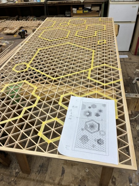 建具職人が年々減少しているなかで組子が出来る若き建具職人は、福井は特に希少となっておりますので、同業他社からの依頼もございます。今回ご施主様の希望で『組子柄に着色してほしい』となり、同業の組子職人でも着色事例が極めて稀で、あっても良いと思える物を見た事が無かったので僕自身も最初は尻込みしましたが、お客様の組子への熱き想いに応えたい一心で製作を敢行しました。